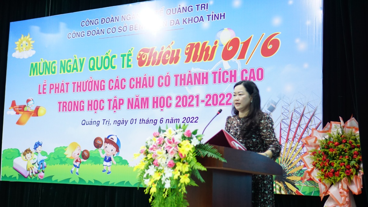 Hòa chung không khí đón chào Ngày Quốc tế thiếu nhi 01/6, được sự quan tâm của Đảng ủy, Ban giám đốc, Công đoàn, Ban Nữ công Bệnh viện đa khoa tỉnh Quảng Trị phối hợp với Đoàn thanh niên đã tổ chức chương trình mừng Ngày Quốc tế Thiếu nhi và trao thưởng cho các cháu có thành tích trong học tập năm học 2021-2022 cho con em cán bộ, viên chức, người lao động trong Bệnh viện. Nhằm nâng cao trách nhiệm cơ quan, gia đình, cộng đồng và toàn xã hội với sự nghiệp chăm sóc, bảo vệ, động viên và giáo dục trẻ em.