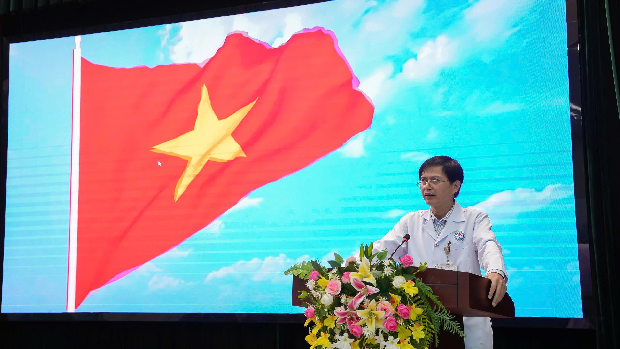 BSCKII Phan Xuân Nam – Bí thư Đảng ủy, Giám đốc Bệnh viện phát biểu tại buổi lễ chào cờ