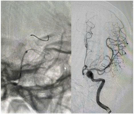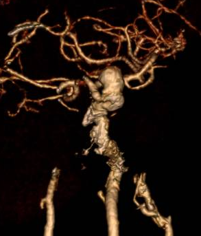 Ngay khi nhập viện, các bác sỹ nghi ngờ bệnh nhân có bất thường hệ thống mạch máu não nên đã chỉ định chụp cắt lớp vi tính mạch máu não cho bệnh nhân. Kết quả hình ảnh chụp cắt lớp vi tính mạch máu não cho thấy,bệnh nhân có túi phình lớn ở động mạch cảnh trong trái, kích thước khoảng 10 x 8 x 6mm,khu trú tại đoạn động mạch mắt.