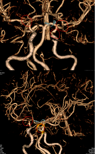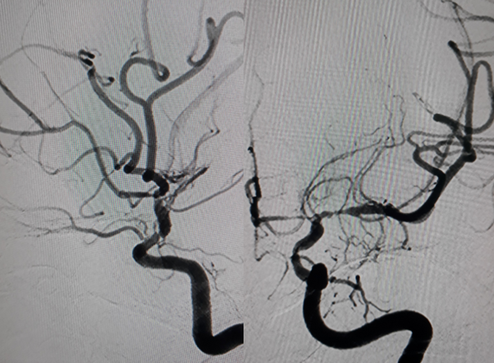 Bệnh nhân tiếp tục được được chụp CLVT mạch máu não: Phát hiện hẹp khít động mạch cảnh trong trái đoạn mấu giường và động mạch não giữa đoạn M1 hai bên.