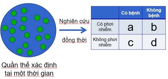 + Định nghĩa: Nghiên cứu cắt ngang (Cross sectional study) là nghiên cứu được thực hiện tại một thời điểm hay trong khoảng một thời gian ngắn, mỗi đối tượng chỉ thu thập thông tin một lần và không theo dõi xuôi theo thời gian như trong nghiên cứu đoàn hệ tương lai. Các yếu tố phơi nhiễm (exposures) và bệnh đều ghi nhận vào cùng một thời điểm vì vậy khó xác định được mối liên hệ nhân quả (bệnh và phơi nhiễm cái nào xảy ra trước).
