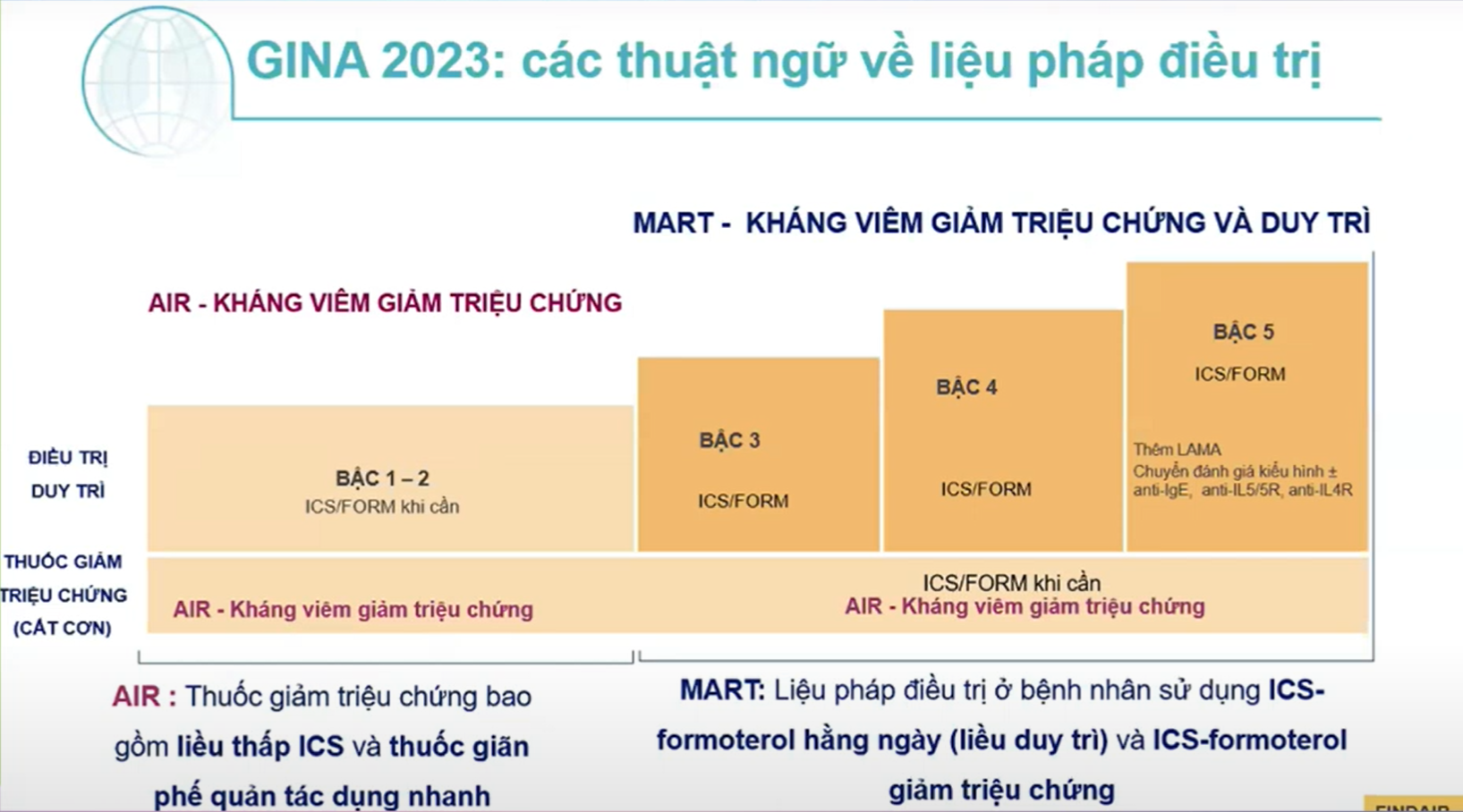 - ICS-Formoterol kháng viêm giảm triệu chứng +/- duy trì giảm nguy cơ các đợt kịch phát nặng so với LPTT trên 5 bậc hen (Từ bậc 1 đến 5 đều có bằng chứng mạnh).