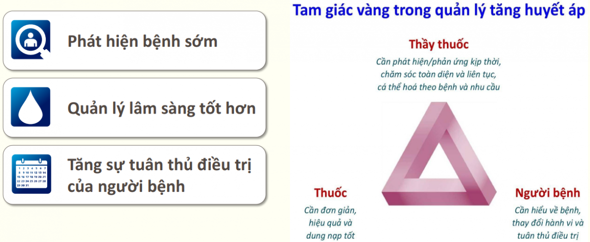 Tăng huyết áp vẫn là vấn đề toàn cầu và là gánh nặng lớn cho sức khỏe cộng đồng. Cập nhật mới của Hội tăng huyết áp thế giới năm 2020 và bộ y tế Việt Nam năm 2020 với mục tiêu HA tối ưu thấp hơn trước, xu hướng phối hợp thuốc liều thấp ngay từ đầu, chú ý đến giảm tổn thương và biến cố trên cơ quan đích, đặc biệt là “ tam giác vàng” trong điều trị tăng huyết áp sẽ giúp chúng ta điều trị, quản lý bệnh nhân THA một cách tích cực và toàn diện hơn.