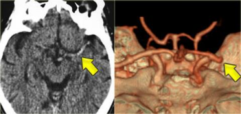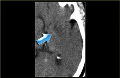 Hình ảnh tăng tỷ trọng động mạch não giữa MCA bên trái, do huyết khối hoặc tắc mạch. Tương ứng với tắc MCA trên CTA.