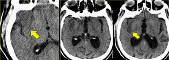 - Hình ảnh điển hình là giảm tỷ trọng theo vùng cấp máu động mạch. Tuy nhiên thường không có thay đổi về hình ảnh trong giai đoạn sớm hoặc đôi khi thấy được các dấu hiệu sớm (tăng tỷ trọng lòng động mạch, giảm tỷ trọng nhân bèo, xóa rãnh cuộn não, dấu “dải băng thùy đảo”, mất ranh giới trắng-xám, xóa các rãnh não).