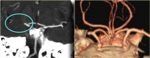 Hình ảnh tắc động mạch não giữa MCA bên phải trên CTA
