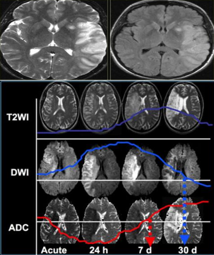 Hình ảnh T2/FLAIR và DWI/ADC thay đổi theo các giai đoạn tiến triển của nhồi máu.