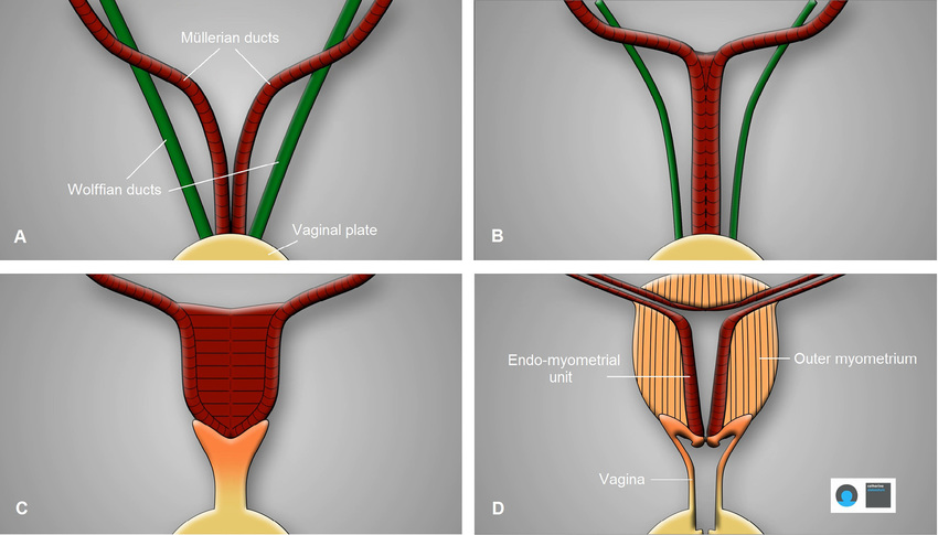 Hình 1. Hai ống Muller (màu đỏ) hợp nhất với nhau tại đường giữa để hình thành tử cung, đoạn gần trở thành vòi trứng, Hai ống Wolft (màu xanh) thoái hóa.