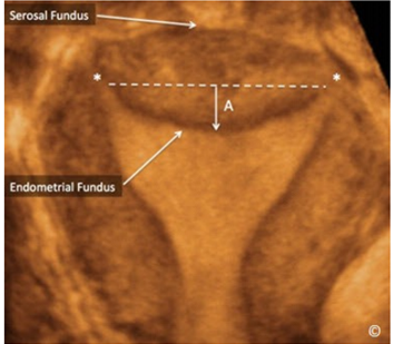 Hình 5: Hình ảnh tử cung ở mặt phẳng giữa trán trên siêu âm 3D cho thấy thanh mạc vùng đáy tử cung (serosal fundus), nội mạc vùng đáy tử cung (Endometrial Fundus) và vị trí của 2 lỗ trong vòi trứng (hoa thị). Lưu ý rằng chỗ lõm của nội mạc vùng đáy tử cung (A) được đo từ trung điểm đường nối 2 lỗ trong vòi trứng đến điểm giữa nội mạc vùng đáy tử cung ( mũi tên A).