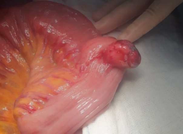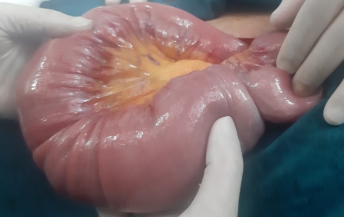 Bệnh nhân được chẩn đoán: Lồng ruột non/ Thiếu máu nhược sắc, hồng cầu nhỏ và được chỉ định mổ cấp cứu. Mở bụng đường giữa trên rốn, vào ổ bụng thấy khối lồng hỗng-hỗng tràng dài khoảng 30 cm nằm ở vùng thượng vị. Khối lồng tương đối lỏng lẻo.