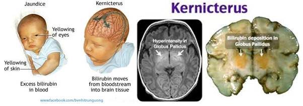 + Bệnh não cấp do biliribin: triệu chứng xảy ra trong tuần đầu tiên như bú kém, bỏ bú, li bì, khóc thét, mất phản xạ bú, gồng ưỡn người, co giật… + Bệnh não mạn do bilirubin( vàng da nhân): triệu chứng độc tính trên não không hồi phục như bại não, yếu liệt chi, nghe kém…