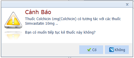 | 7 | Colchicin | Clarithromycin/ Erythromycin | Tăng độc tính của Colchicin, đến mức nguy hiểm. | Tránh phối hợp, đặc biệt trên bệnh nhân suy thận - Nếu bắt buộc phối hợp: + Giảm liều colchicin + Theo dõi các dấu hiệu độc tính của colchicin (tiêu chảy, sốt, đau cơ, giảm bạch cầu, tiểu cầu,..) - Có thể xem xét thay clarithromycin/ erythromycin bằng azithromycin, thay fluconazol bằng miconazol. |