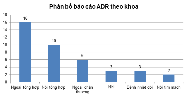 Số lượng báo cáo ADR từ khoa Ngoại Tổng hợp nhiều nhất với 16 báo cáo chiếm tỷ lệ 40%, tiếp theo là khoa Nội Tổng hợp với 10 báo cáo chiếm tỷ lệ 25%, Khoa Ngoại chấn thương 6 báo cáo chiếm tỷ lệ 15%.